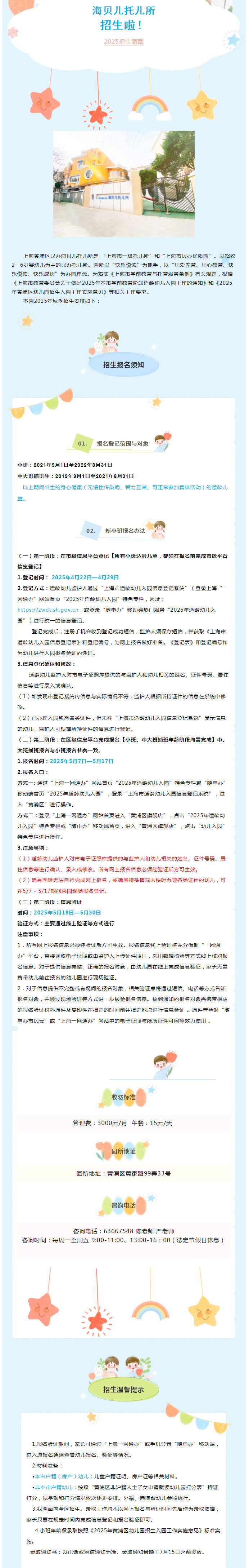 上海黄浦区民办海贝儿托儿所是 “上海市一级托儿所”和“上海市民办优质园”。以招收2--6岁婴幼儿为主的民办托儿所。以“快乐阅读”为抓手,以“用爱养育、用心教育、快乐悦读、快乐成长”为办园理念。根据《上海市教育委员会关于做好2022年本市学前教育阶段适龄幼儿入园工作的通知》等相关工作要求,本园2022年秋季招生安排如下:
