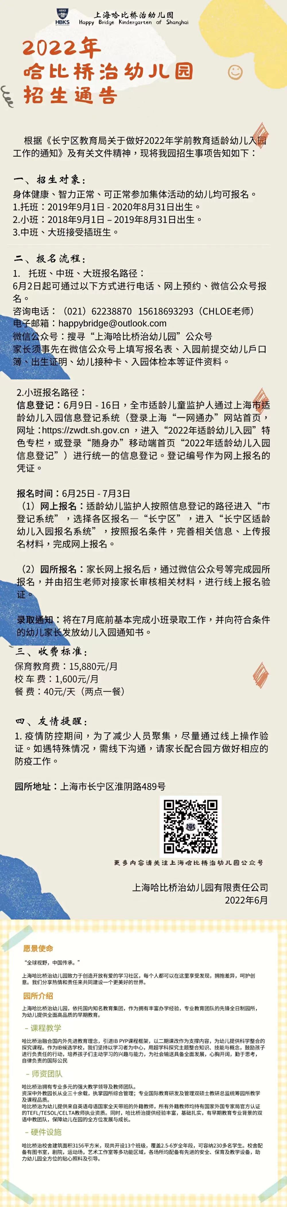 上海长宁民办哈比桥治幼儿园坐落于淮阴路489号。由顺德教育集团投资承办、经上海长宁区教育局发证许可的幼儿园。总占地面积约2023平方米,幼儿园欧美设计,环境优美,设备设施齐全,有宽敞的塑胶操场、足球场、假山喷水金鱼池、阳光运动房、玩沙池、多功能舞蹈厅。开设托班、小班、中班、大班,招收年龄从2~6周岁的中、外幼儿,哈比桥治幼儿园实行董事会领导下的园长负责制。