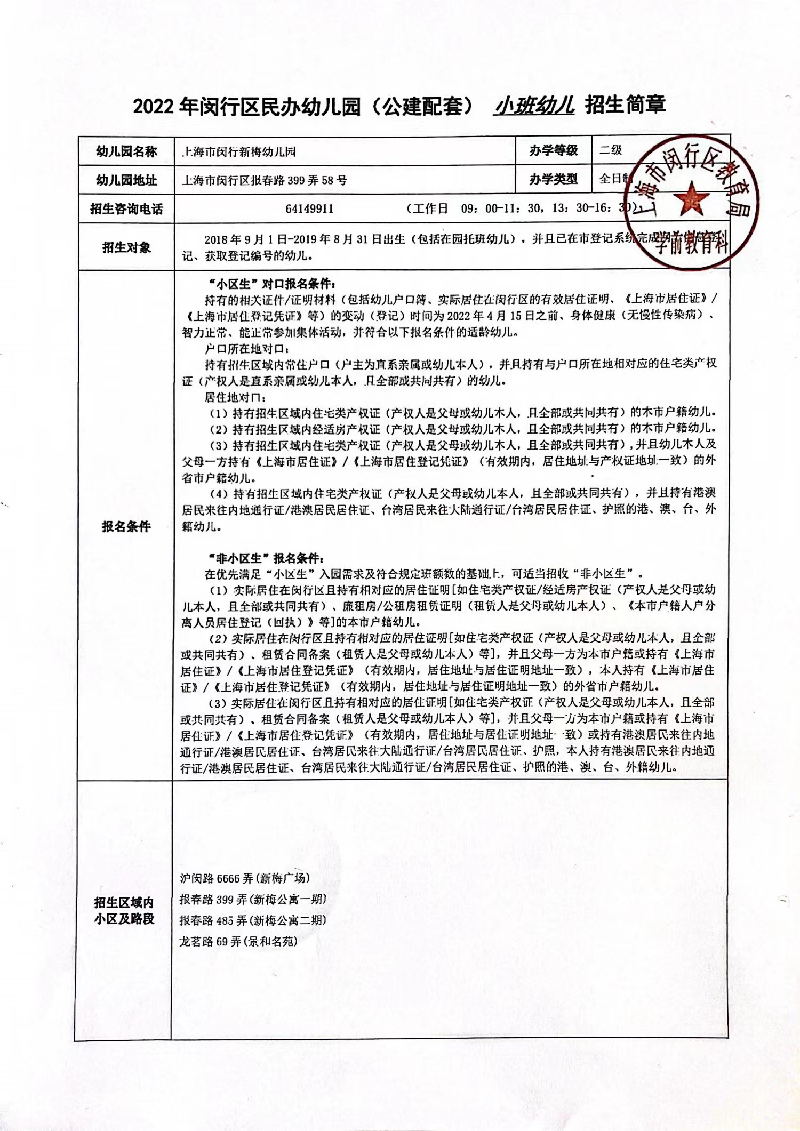 上海新梅幼儿园于2008年9月正式开园,全园占地3000平方米,室内面积约1700平方米。可容纳9个班级。充分贯彻爱和自由,规则和平等这一教育理念,保证新园教学秩序的建立和教学目标的完成。