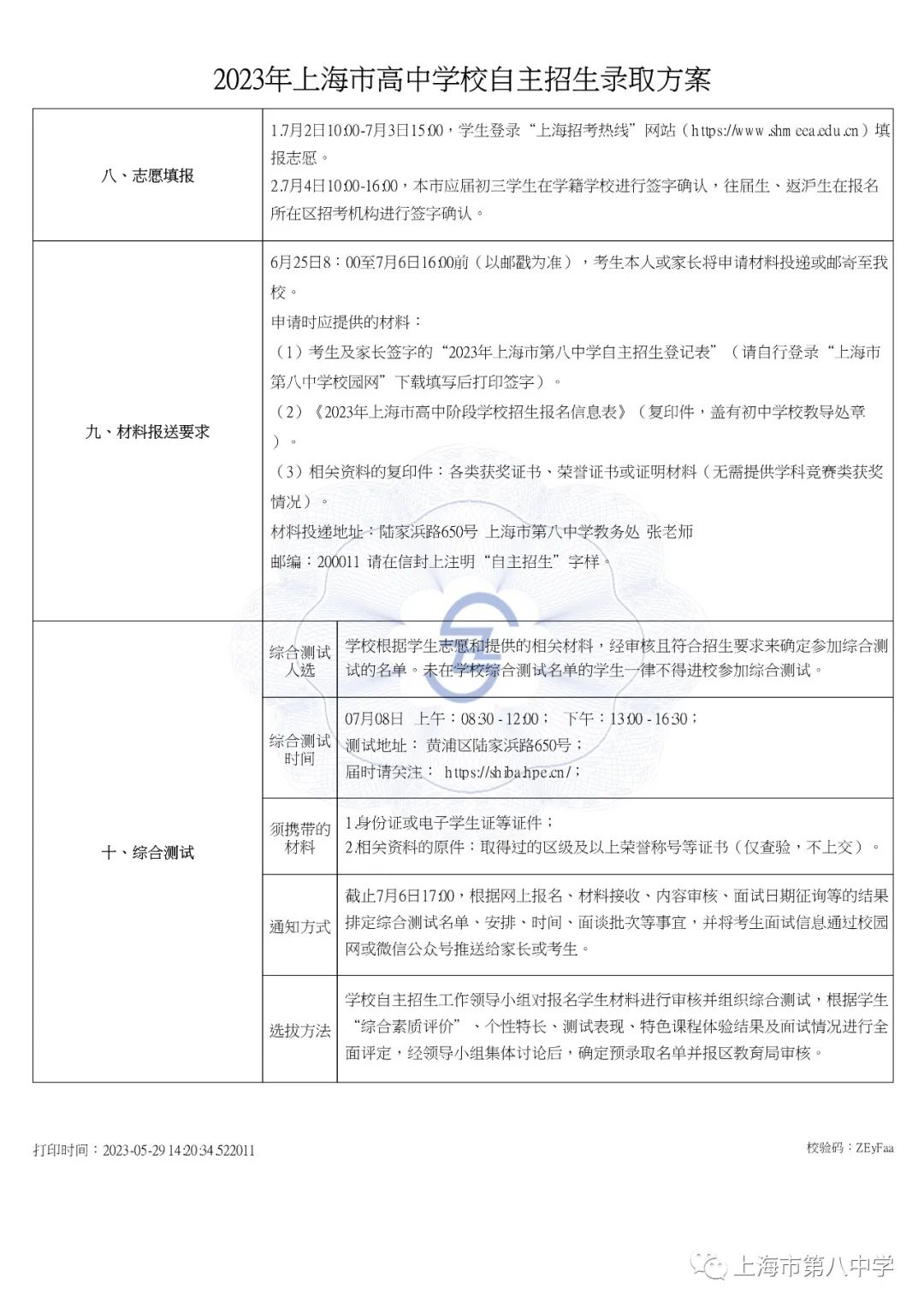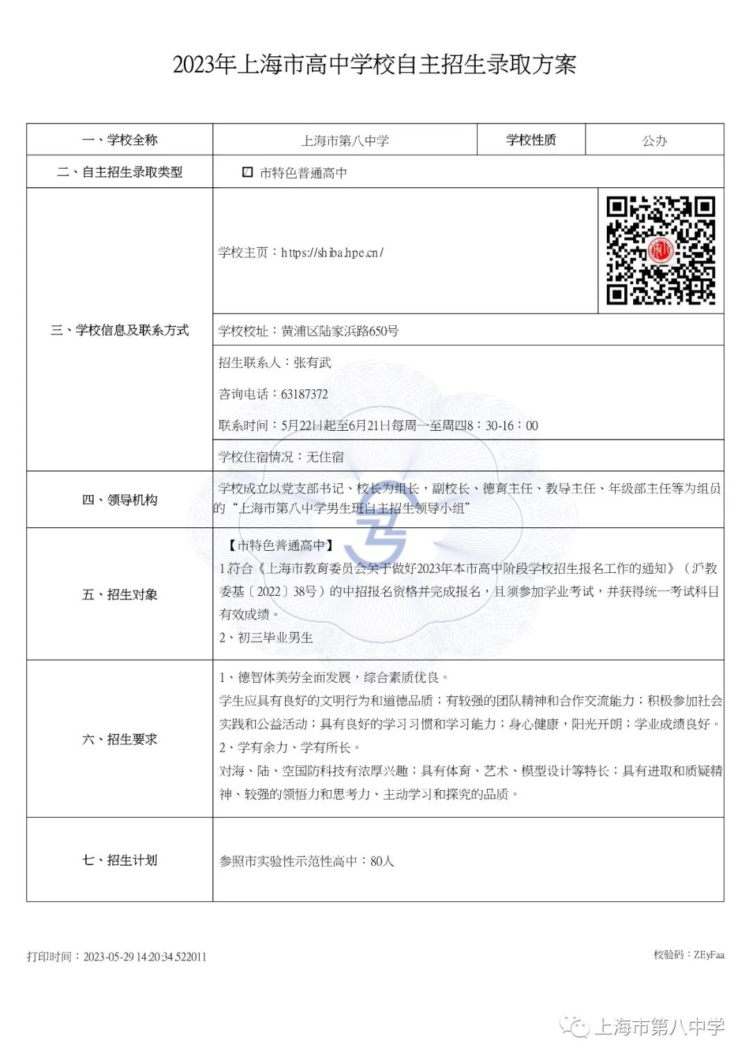 各位初三同学和家长: 你们好! 今日起至4月4日,我校开展“线上校园开放日”活动。相关内容通过学校官方微信公众号(上海市第八中学)和学校官网http://shiba.hpe.cn/进行发布和展示。 欢迎你们的到来! 活动提示: (1)“线上校园开放日”(3月27日至4月4日)期间,您可注册参与互动交流(见本文末),留意报考意向。 (2)2021年我校共招收8个班级,其中面向全市提前自主招生4个男生班(详见“男生班提前批招生政策”板块介绍);面向黄浦区中考“统招批次”4个班级,男、女生兼收,欢迎初三学生报考我校。 (3)根据市教委统一要求,我校承诺按照“规则在先,程序规范,阳光透明”的原则进行自招工作。 上 海 市 第 八 中 学 2021年3月27日 01 学校概况 上海市第八中学创建于1861年,前身是美国基督教长老会传教士范约翰及其夫人来沪创办的“清心书院”。2012年3月,上海市教委批复同意我校开设“上海市男子高中基地实验班”,研究男生成长规律,探索适合男生特点的课程方案和教育内容,形成体现男生特点的培养模式及方法,创设有利于学生健康成长的教育环境。 学校办学历史悠久、文化积淀厚重、硬件设施完善、行政管理高效、地理位置优越,是一所深受家长和社会认同的优质高级中学。学校秉承“以诚养德,以静修业”的校训,以“科学求真、人文求善、艺术求美”为办学理念,开创以“智诚”为特色的学校教育,培育“浩然正气、乐学善思”的优秀学子。 学校具有光荣的爱国主义传统和良好的校风、教风和学风,为国家培养了一大批能人英才,其中不乏学术精英、商界才俊、艺术翘楚,更不乏为现代中国的腾飞贡献出智慧和力量的优秀建设者,参与创建中国第一所儿童医院的著名儿科专家苏祖斐、数学家中科院院士胡和生、作曲家中国音协第四届副主席瞿希贤、著名电影导演史蜀君以及革命伟人孙中山先生的孙女、著名社会活动家孙穗芳等都是市八校友。 VR漫步市八校园 参观特色课程体验中心 长按扫码进入 云上参观校园,可以全程自动播放,也可指尖滑动自主体验。 注:北大楼是上海市优秀历史保护建筑,也是我校特色课程体验中心。 02 课程建设 学校的课程建设始终秉承“百年智诚”的办学核心内涵,以培养学生“忠诚、担责、独立、睿智”四大品质为目标,落实立德树人的根本任务,以“尊重和满足每一个学生的成长需求”为宗旨,课程不仅满足学生学科知识的学习需求,更加凸显关注学生在品德形成和人格发展、潜能开发和认知发展、体育与健身、艺术修养和社会实践等学程经历。 我校规范执行国家课程的校本化实施,“智诚”课程体系科学完整且特色鲜明。 必修课程、选择性必修课程和选修课程有效整合,体现出高中三个年段课程目标整体布局、分步实施以及课程结构多元、满足学生自主选择、差异发展的特点。 图片 “智诚”教育课程体系 (点击看大图) 03 师资队伍 学校师资力量雄厚。校长周政,是上海市特级校长,上海市督学;上海市教育学会高中教育管理专业委员会副主任,上海市中学高级教师专业技术职务任职资格评审专家组成员。周校长从教三十余年,有近十六年的校长经历,她始终坚持教育理想,精进有为地治理学校。 在学校蓬勃进取的教师队伍中,有特级教师1人,正高级教师2人、上海市“攻关计划”主持人1人,名师工作室导师1人,学科带头人2人,区级骨干教师4人,名师工作室学员7人,校级骨干8人,硕博学位26人,市区园丁奖(含市劳模)26人。学校教师在各级各类比赛中屡获佳绩。目前,学校已形成了“学校管理规范民主、教职员工乐业荣校、教学质量稳步提高”的良好态势。 捷报频传 04 特色创新 2012年3月30日,上海市教委颁发“关于同意上海市第八中学开设‘上海市男子高中基地实验班’的批复”。同年7月,全市乃至全国首创的两个“男子高中基地实验班”(简称“男生班”)在市八校园诞生。从当初的两个试点班,到如今每年级四个男生班的规模,在九年的教育教学实践中,学校潜心探索男生成长规律,精心研究适合男生特点的课程与教育内容,精进打造体现男生特质的培养模式。 根据“忠诚、责任、独立、睿智”的培养目标,学校开发了男生必修的“四领域”特色课程。一是以典范为载体的偶像生成领域课程,引导男生学偶践行,胸怀天下之广博;二是以生活为载体的生存体验领域课程,引导男生善于担当,厚积生活之经验;三是以文化为载体的差异理解领域课程,引导男生独立思考,锤炼思维之通达;四是以科技为载体的数字达人领域课程,引导男生与时俱进,体验时空之穿越。 社会各方教育资源汇聚我校,男生班的成长获得了多元的支持,学生们获得了丰富的学习经历,这为他们的人生积淀了成长的养料。我校与华东师范大学签订教育合作协议书,由理化生教师带队前往华师大实验室开展物理、化学等实验探究,拓展科学思维;与中国船舶及海洋工程设计研究院(708所)紧密合作,让学生了解最前沿的科技创新领域;与上海东方航空合作成立“高中生飞行俱乐部”,帮助学生实现冲上云霄的航天梦;同时借力高校专业师资,不断开发适合男生的前沿课程,与上海交大合作开发BIM&VR技术科普应用课程,与东华大学合作开发AI机器人陆战演习课程,与上海工程技术大学飞行学院合作开发直升机模拟操作课程,与上海海事大学合作开发航海模拟仿真课程等