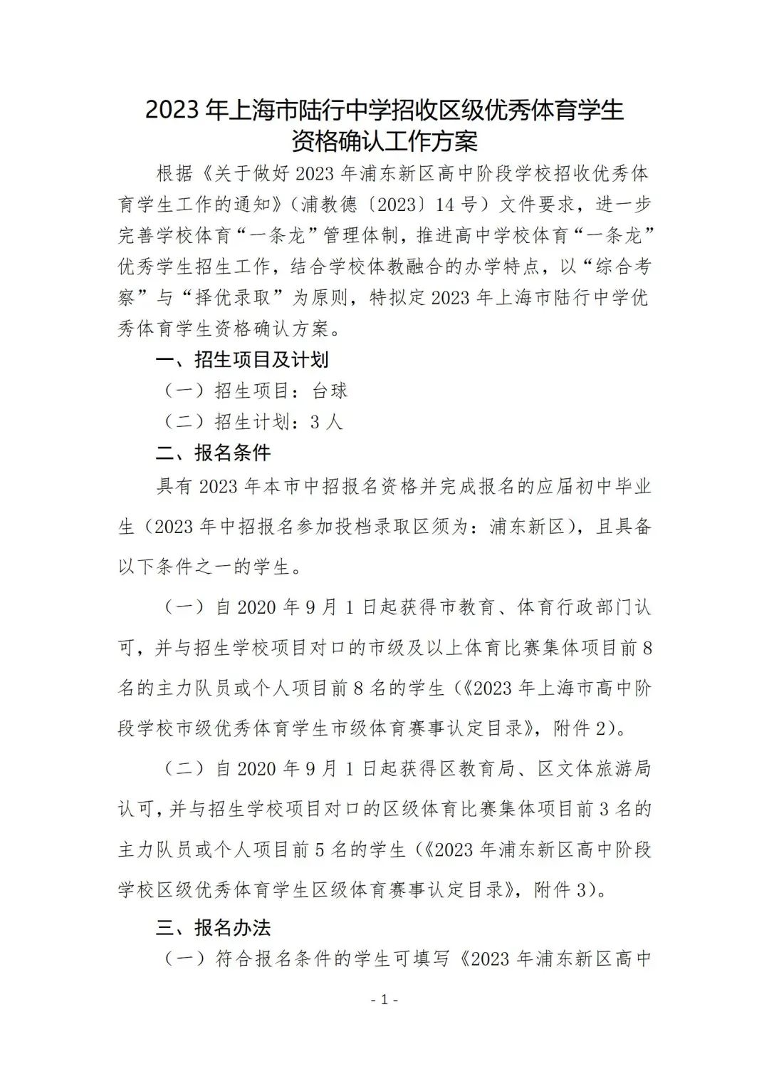 2023年上海市陆行中学招收区级优秀体育学生 资格确认工作方案